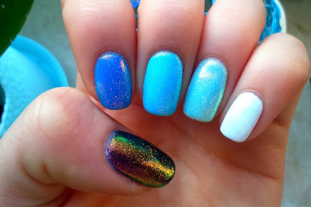 Kolory na paznokciach świetne, różne odcienie niebieskiego świetne :). Jednak dla mnie ten pyłek na każdym paznokciu to za dużo 🙂