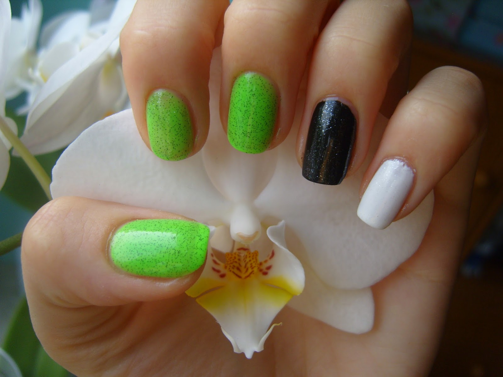 Lakiery: zielony marmurek Lemax, biały Ados 502, czarny Golden Rose 35, opalizujący glitter Astor